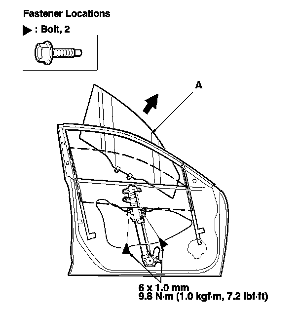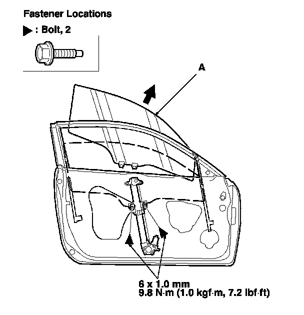 6. Carefully raise the glass (A) until you can see the bolts, then remove them. Carefully pull the glass out through the window slot. Take care not to drop the glass inside the door.
