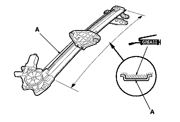 9. Apply multipurpose grease to all the sliding surfaces of the regulator (A) where shown. 4-door is shown; 2-door is similar.