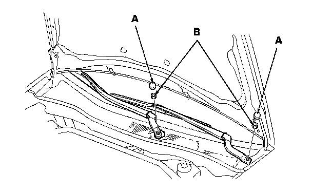 1. Open the hood. Remove the caps (A) and nuts (B).