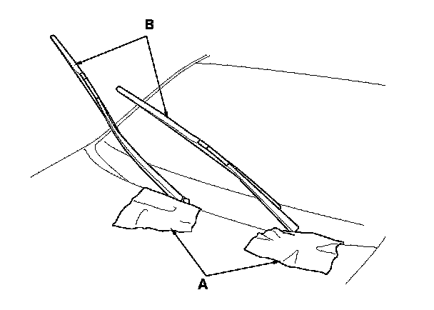 3. Raise the wiper arms (B) off the windshield, then remove the wiper arms.