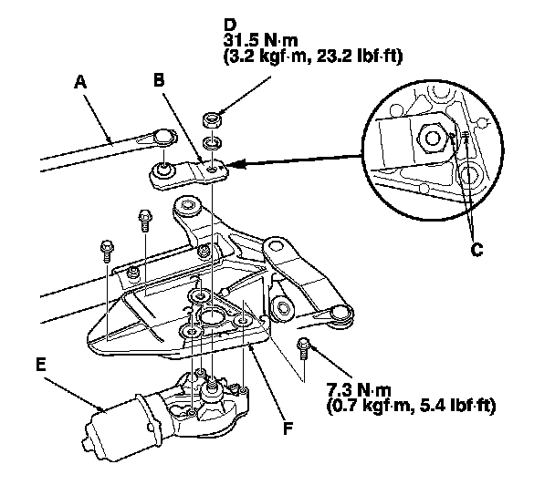 9. Remove the three bolts, and separate the wiper motor from the linkage (F).