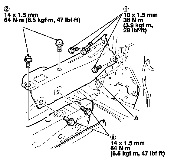 4. Install the gusset in the reverse order of removal. When installing the mounting bolts for the middle cross-member gusset (A), torque the mounting hardware in the sequence shown. If the mounting bolts are not torqued in this sequence, damage to the quarter panel will occur.