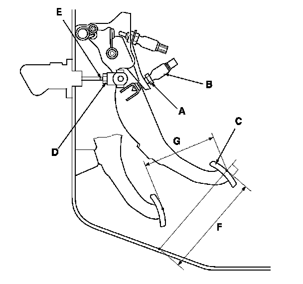 3. Loosen the clutch pushrod locknut (D), and turn the pushrod (E) in or out to get the specified height (F), and the stroke (G) at the clutch pedal. If adjusting the pushrod causes the clutch pedal to contact the clutch pedal position switch, back off the switch further.