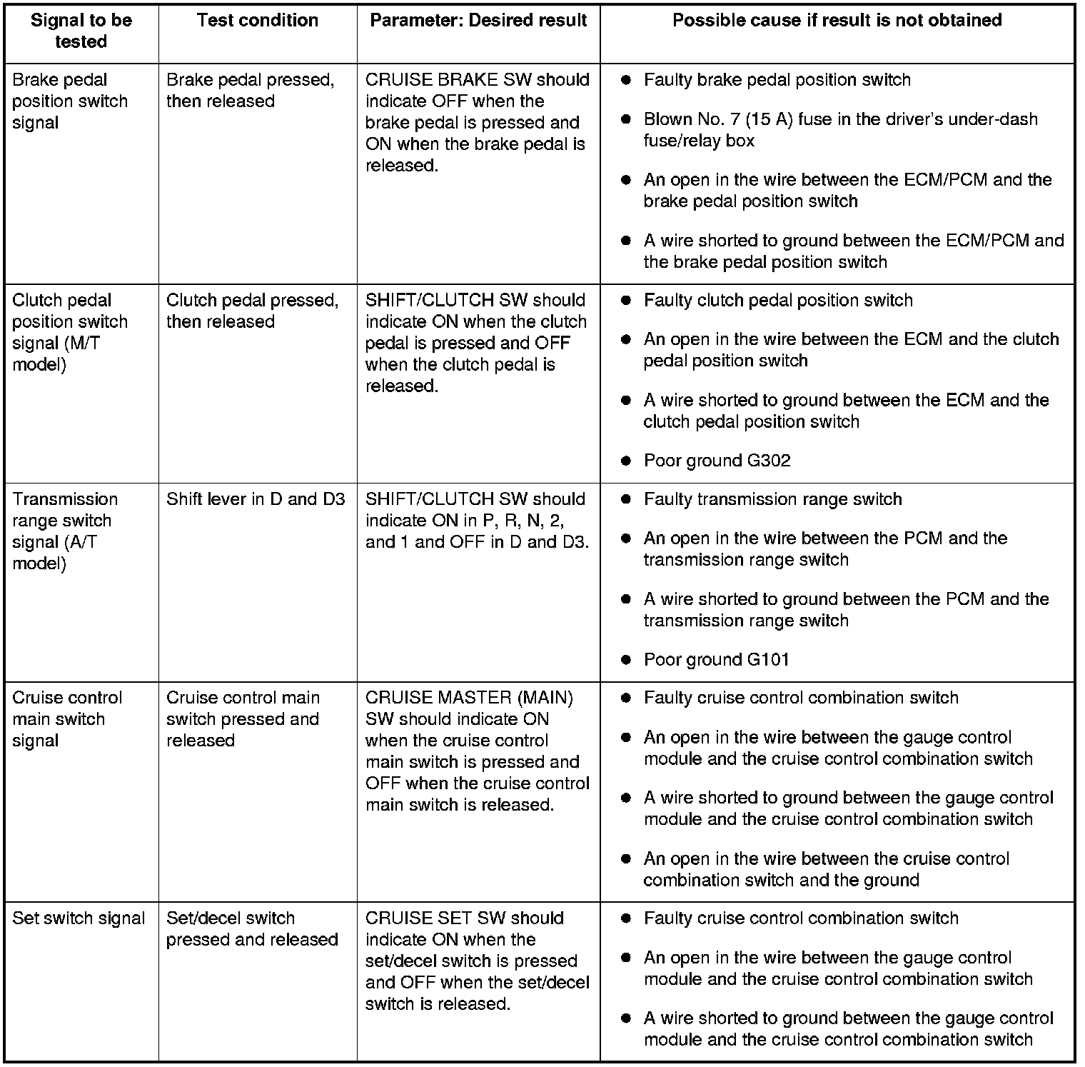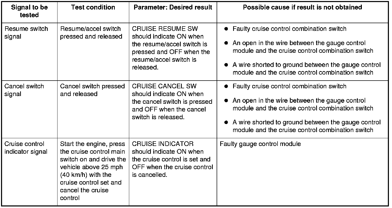 NOTE: Intermittent failures are often caused by loose circuit connections. While monitoring cruise control inputs, flex the circuit wires, and note if any of the test results change.