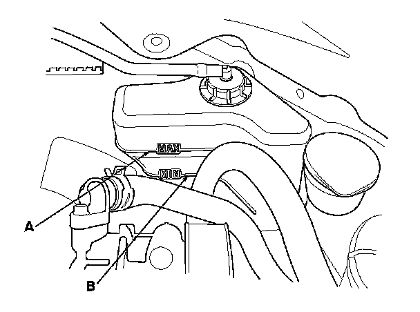 1. Check the coolant level in the coolant reservoir. Make sure it is between the MAX mark (A) and the MIN mark (B).