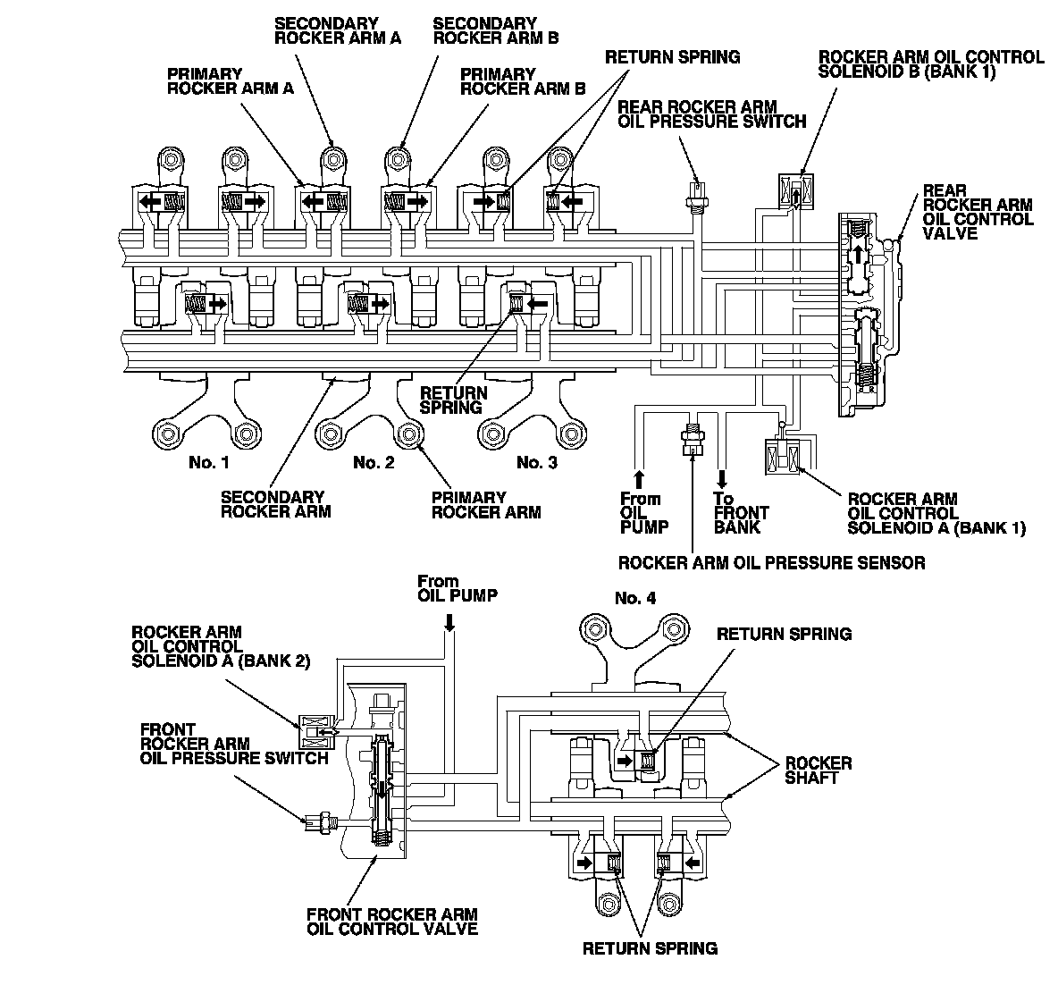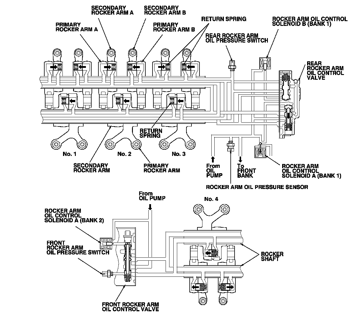 With rocker arm oil control solenoid A (Bank 1) and A (Bank 2) turned on by PCM, the front and rear rocker arm oil control valves switch the oil pressure. Oil pressure then enters the No. 3 and No. 4 cylinder's primary rocker arm from the oil passage in the rocker shaft, causing the VTEC switching piston to slide into the secondary rocker arm and against the return spring. This disengages the primary rocker arm from the secondary rocker arm to stop valve activation. The No. 3 and No. 4 cylinder's rocker arms do not move, and No. 3 and No. 4 cylinders are paused. In the other four cylinders, oil pressure from the front and rear rocker arm oil control valves lock the primary rocker arm and secondary rocker arm together. The rocker arms are moved by the camshaft, and the four cylinders are active.