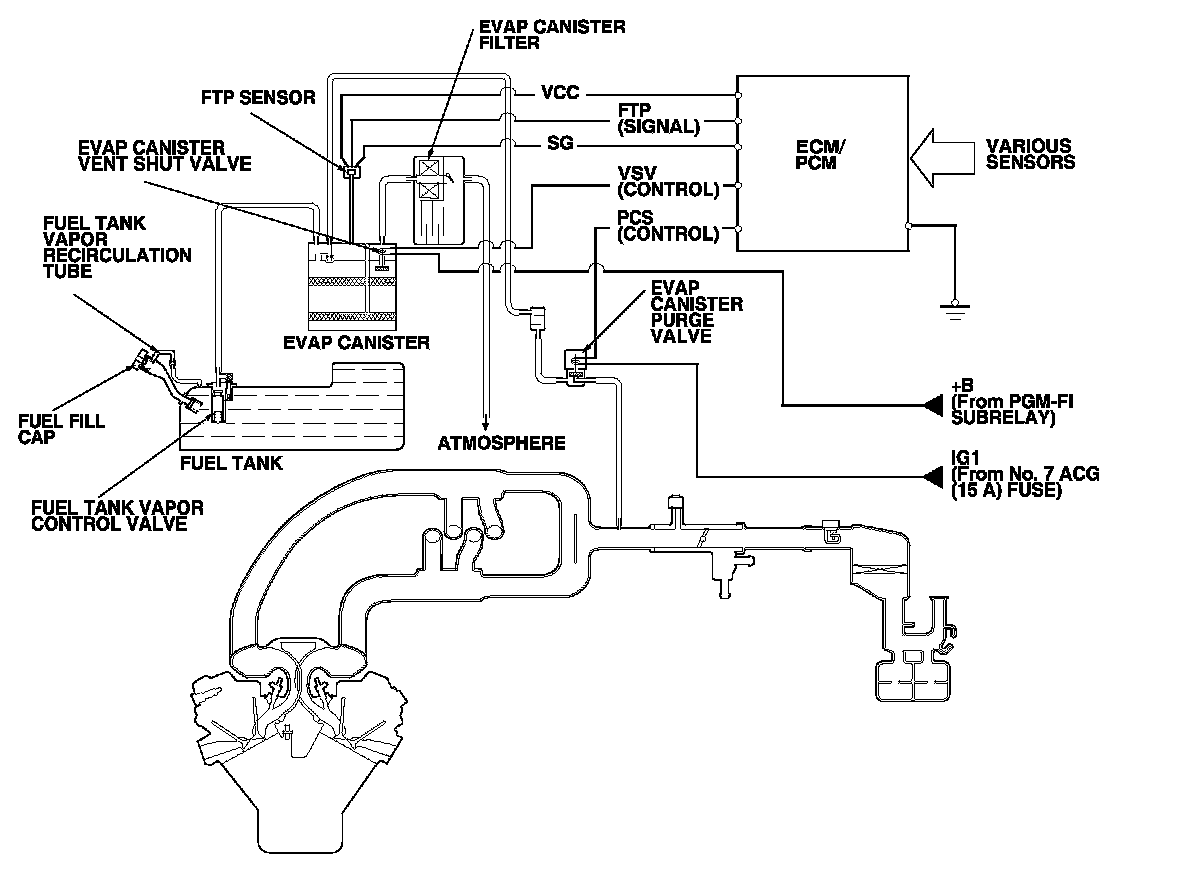 The EVAP controls minimize the amount of fuel vapor escaping to the atmosphere. Vapor from the fuel tank is temporarily stored in the EVAP canister until it can be purged from the canister into the engine and burned.