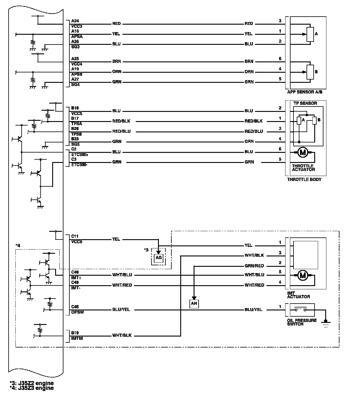 The electronic throttle control system consists of the throttle actuator, throttle position (TP) sensor A/B, accelerator pedal position (APP) sensor A/B, the electronic throttle control system (ETCS) control relay, and the ECM/PCM.