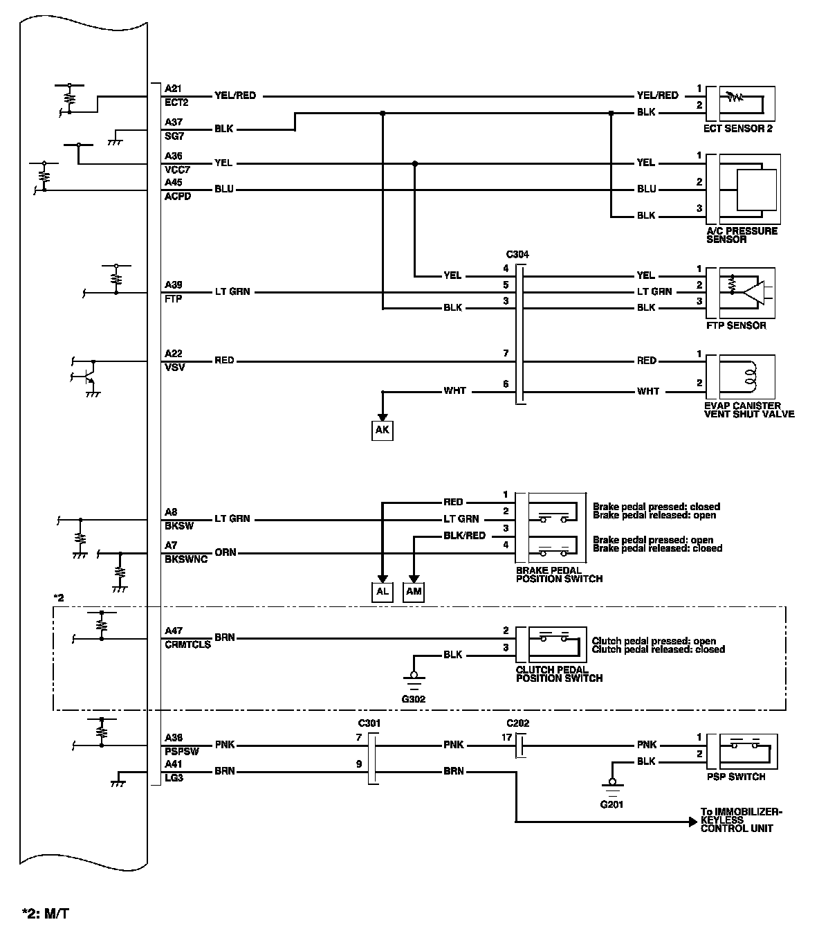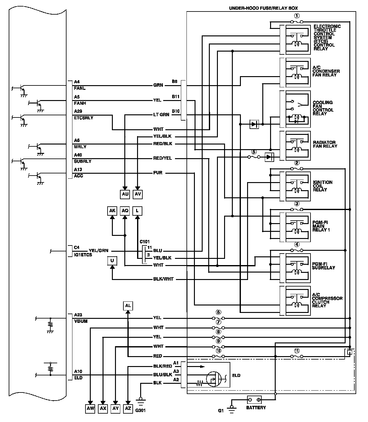 PGM-FI main relay 1 is energized whenever the ignition switch is ON (II) to supply battery voltage to the ECM/PCM, power to the injectors, and power for PGM-FI main relay 2 (FUEL PUMP). PGM-FI main relay 2 (FUEL PUMP) is energized to supply power to the fuel pump for 2 seconds when the ignition switch is turned to ON (II), and when the engine is cranking or running.