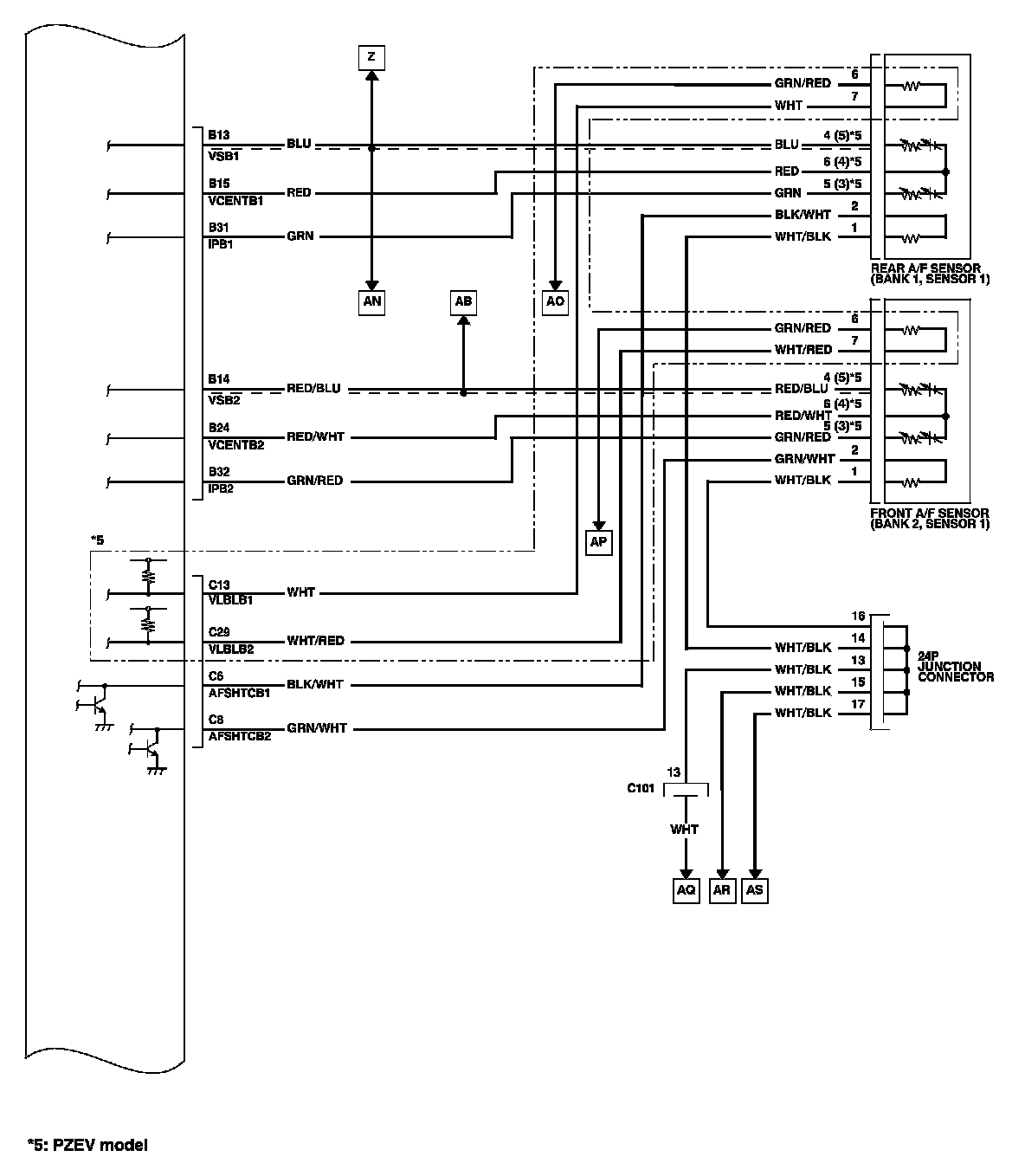 The A/F sensor operates over a wide air/fuel range. The A/F sensor is installed upstream of the WU-TWC, and sends signals to the ECM/PCM which varies the duration of fuel injection accordingly.