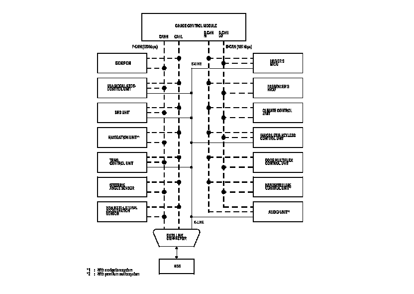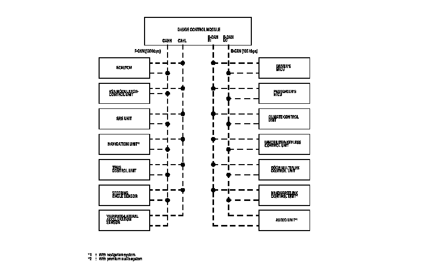 The gauge control module acts as a gateway to allow both systems to share information. The gauge control module translates information from B-CAN to F-CAN and from F-CAN to B-CAN.