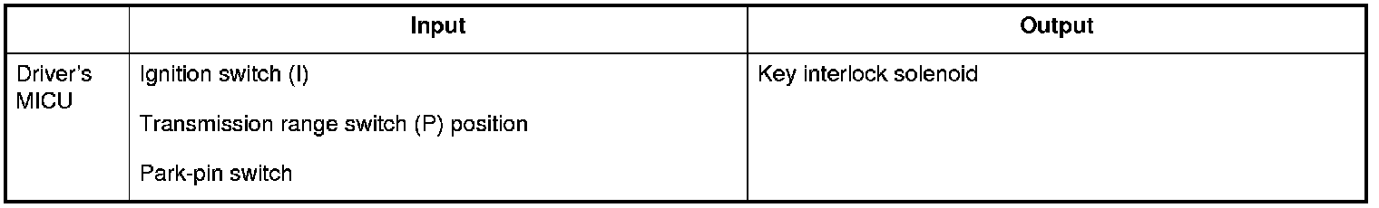 The driver's MICU control of the key interlock solenoid is based on ignition switch ACCESSORY (I) position, the transmission range switch P position, and the park-pin switch signals.