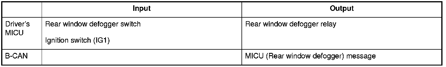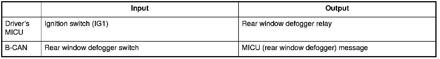 The driver's MICU control of the rear window defogger timer is based on ignition switch and the rear window defogger switch signals.