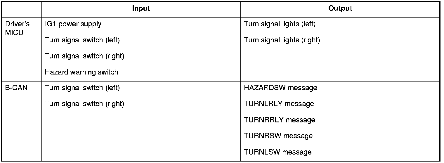 The driver's MICU control of the turn signal/hazard warning lights is based on input signals from the turn signal switch and the hazard warning switch.