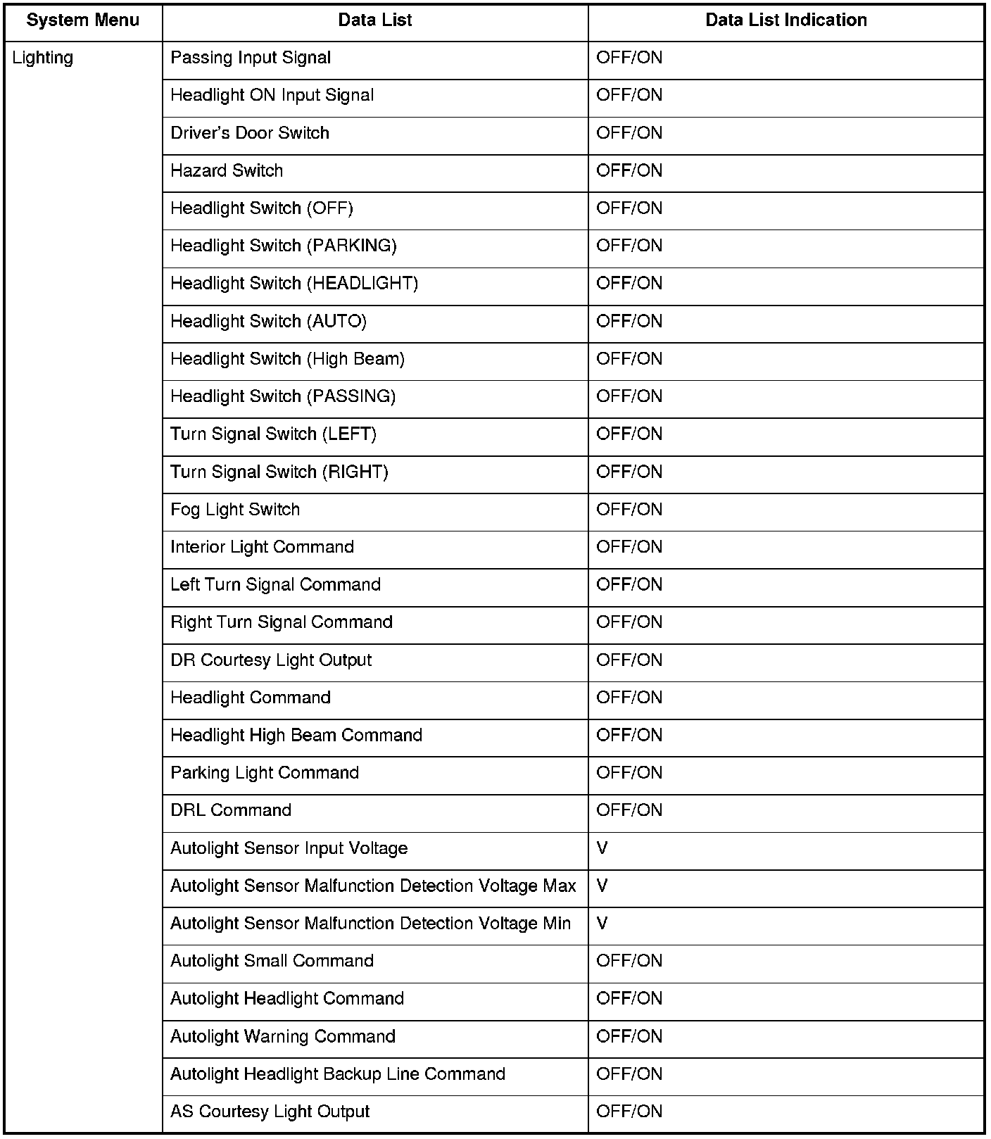 - Exterior lights (including the daytime running lights, and auto-headlights off)
