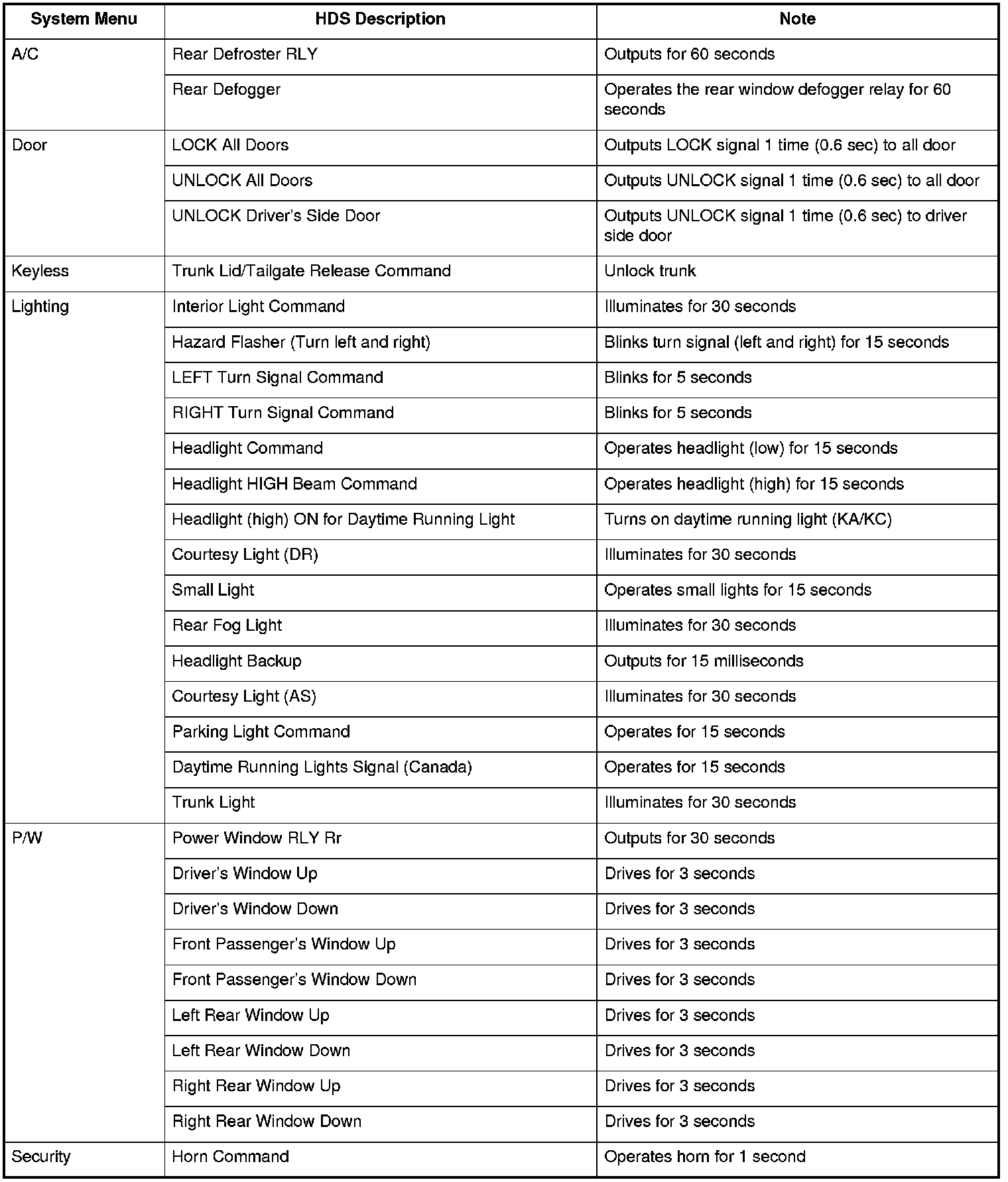 By connecting the HDS to the data link connector (DLC), the HDS can retrieve the diagnostic information from the driver's MICU via a diagnostic line called K-LINE. The K-LINE is separated from the CAN lines, and connected to the CAN related ECUs. The driver's MICU is a gateway between the HDS and B-CAN related ECUs, and sends B-CAN diagnostic information to the HDS. When doing a function test with the HDS, the HDS sends an output signal through the K-LINE to the driver's MICU. The driver's MICU either relays the request to another ECU, or commands the function itself.