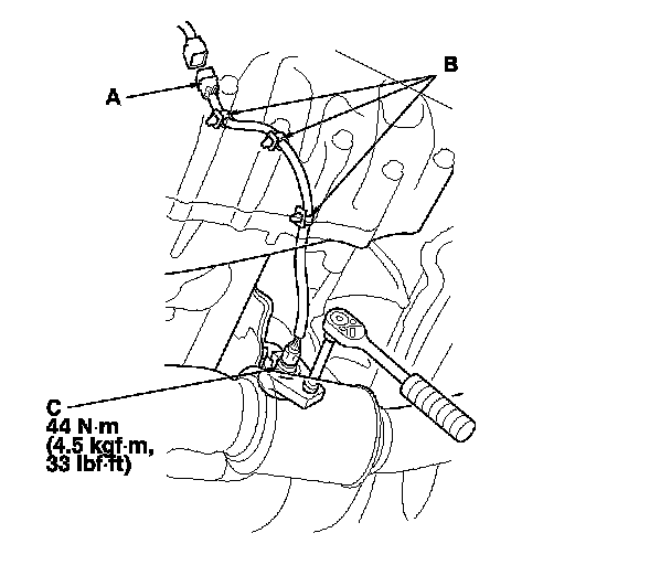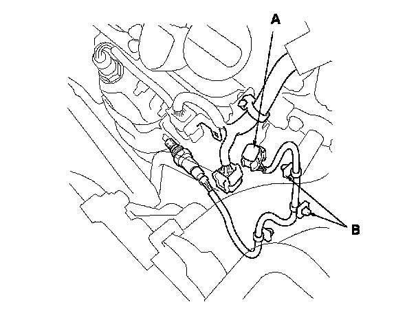 1. Disconnect the front secondary HO2S 4P connector (A), and remove the harness clamps (B).