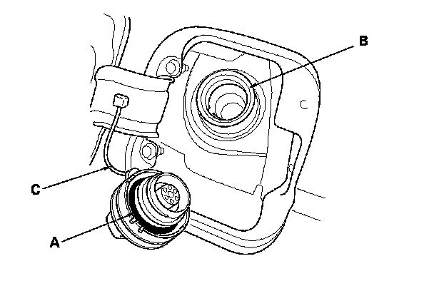 2. Check the fuel fill cap seal (A) and the fuel fill pipe mating surface (B). Verify that the fuel fill cap tether cord (C) is not caught under the cap.