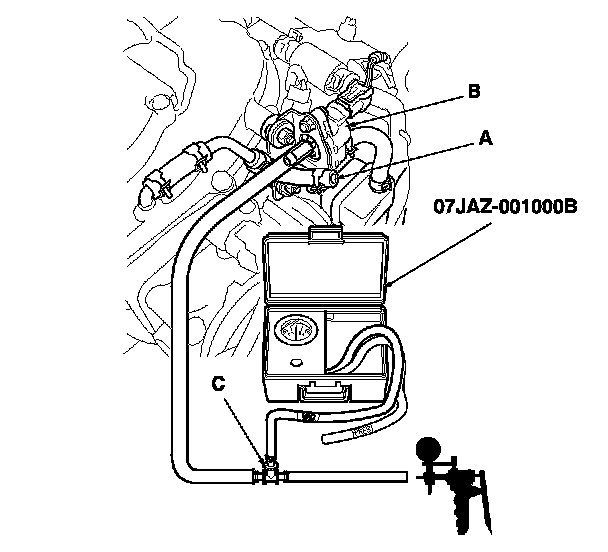 8. Disconnect the vacuum hose (A) from the EVAP canister purge valve (B) in the engine compartment, and connect a T-fitting (C) from the vacuum gauge and the vacuum pump/gauge 0-30 in.Hg, to the EVAP canister purge valve as shown.