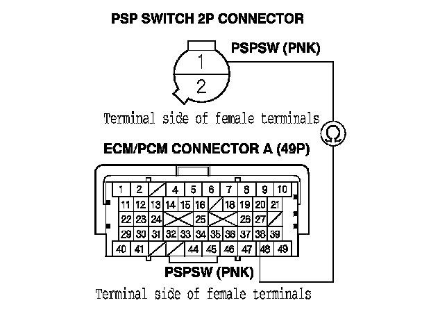 22. Check for continuity between ECM/PCM connector terminal A38 and PSP switch 2P connector terminal No. 1.