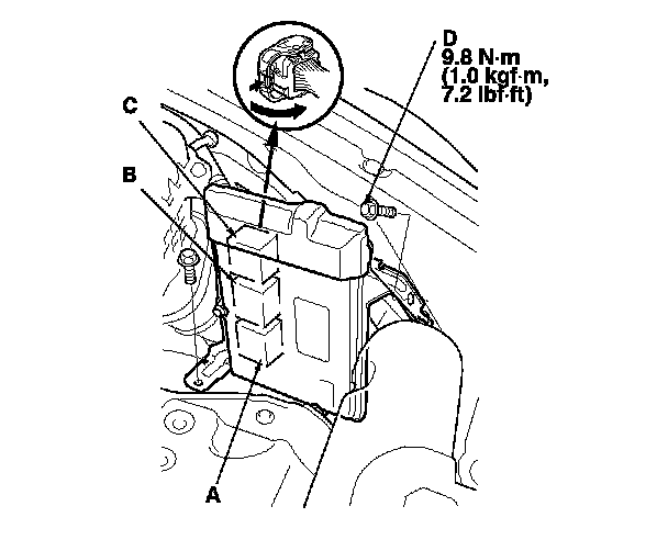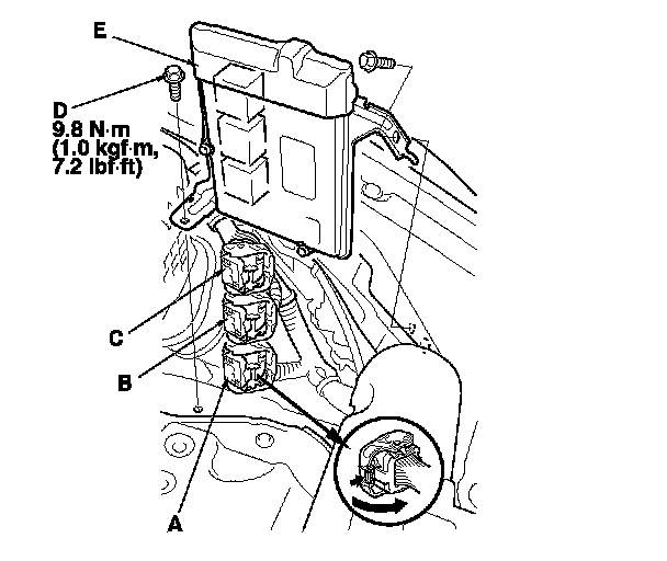 10. Disconnect ECM/PCM connectors A, B, and C, then remove the ECM/PCM assembly (E).