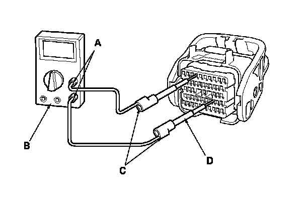 5. Connect one side of the patch cord's terminals (A) to a commercially available digital multimeter (B), and connect the other side (C) terminals to a commercially available banana jack (Pomona Electronics Tool No. 3563 or equivalent) (D).