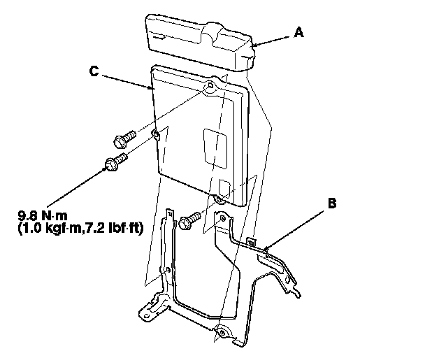 10. Remove the cover (A) and the bracket (B) from the PCM (C).