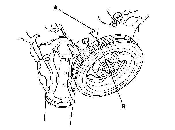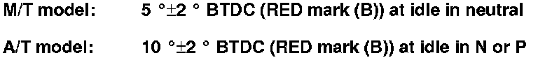 9. Aim the light toward the pointer (A) on the timing belt cover. Check the ignition timing under a no load condition (headlights, blower fan, rear window defogger, and air conditioner are turned off).