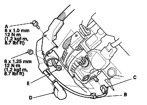 4. Connect the alternator connector (D) and the positive alternator cable (E) to the alternator. Make sure the crimped side of the ring terminal faces away from the alternator when you connect it.