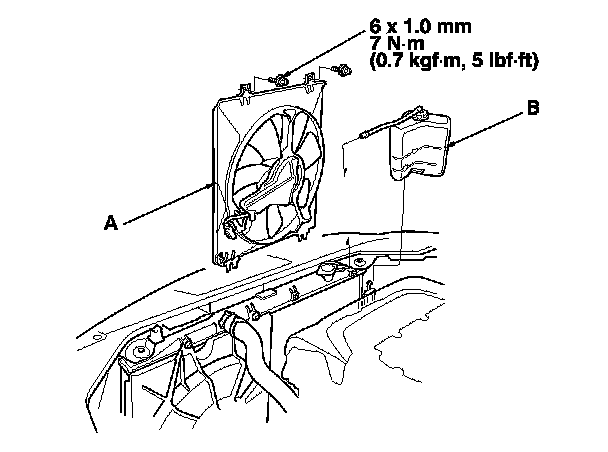 6. Install the A/C condenser fan shroud assembly (A) and the coolant reservoir (B).
