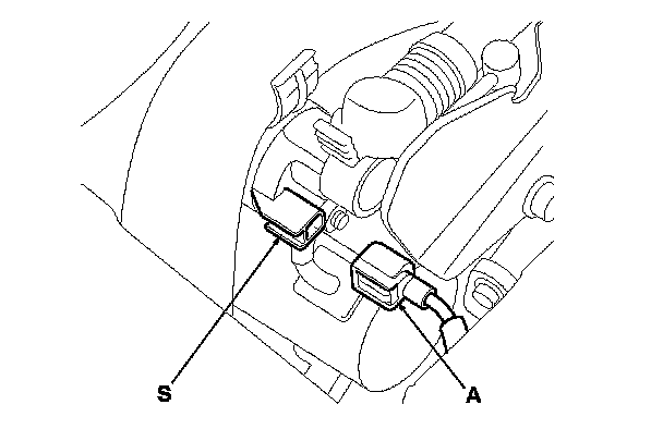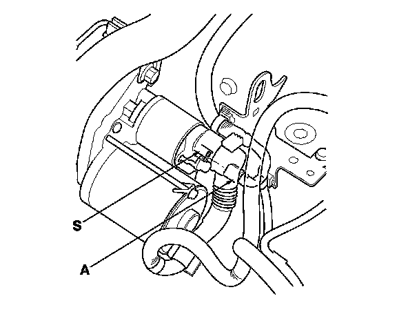 10. Make sure the shift lever is in N or P (A/T model) or neutral (M/T model), then disconnect the connector (A) from the starter S terminal. Connect a jumper wire from the battery positive terminal to the S terminal.
