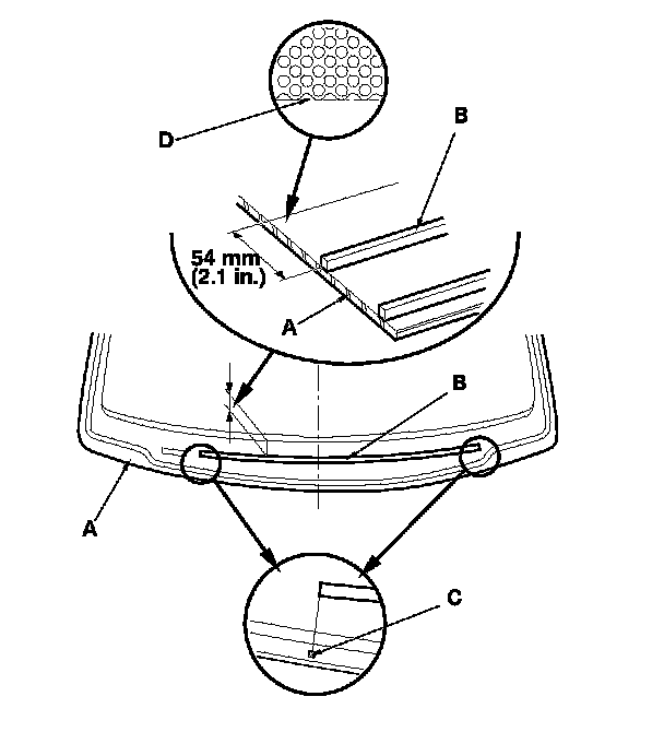 12. Attach the rubber dam A, and the upper clips (B) with adhesive tape to the inside face of the windshield (C) as shown. Before installing the upper clips, apply primer to the area where the adhesive tape will be applied to the inside face of the windshield: