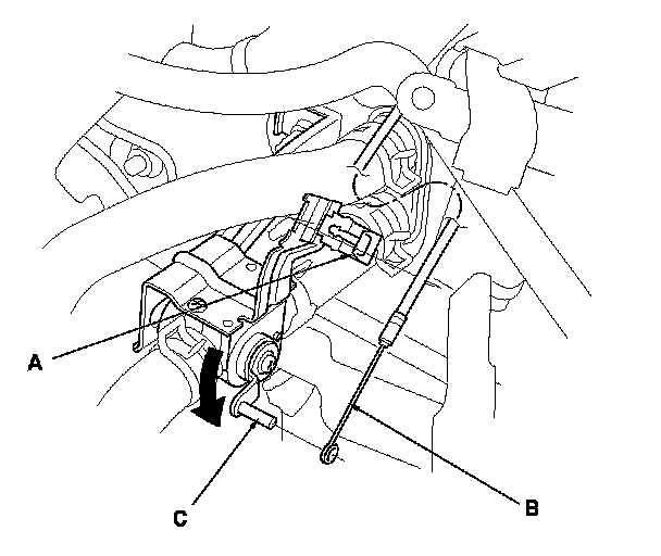 4. From under the hood, open the cable clamp (A), then disconnect the heater valve cable (B) from the heater valve arm (C). Turn the heater valve arm to the fully opened position as shown.