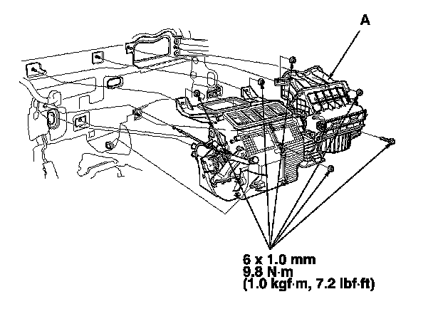 13. Remove the mounting bolt, the mounting nuts, and the blower-heater unit (A).