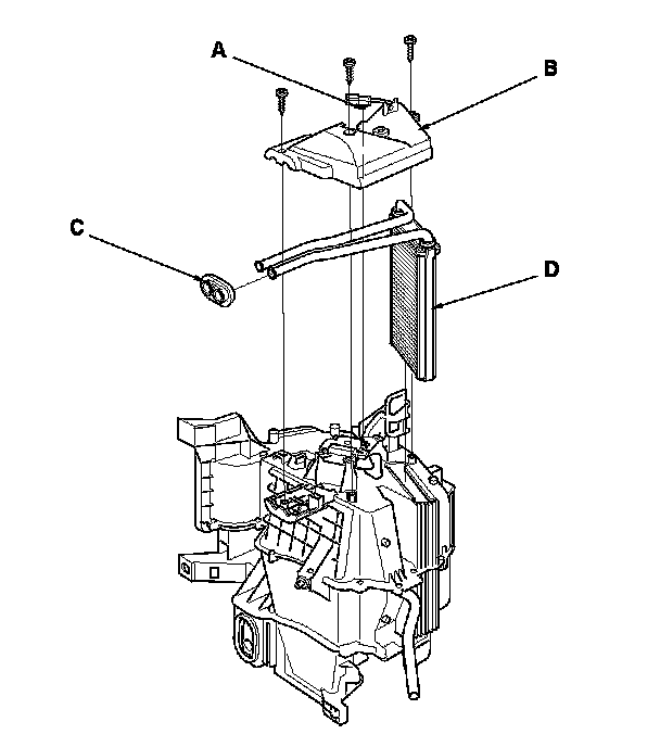 14. Remove the connector clip (A), the self-tapping screws, the heater core cover (B), and the grommet (C), then carefully pull out the heater core (D).