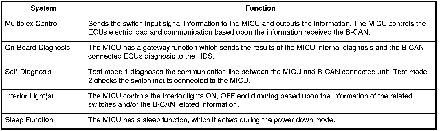 The MICU (built into the under-dash fuse/relay box) is one of the B-CAN components. The MICU controls many systems related to the body controller area and a security system, and also works as a gateway to diagnose the other B-CAN connected ECUs with the HDS.