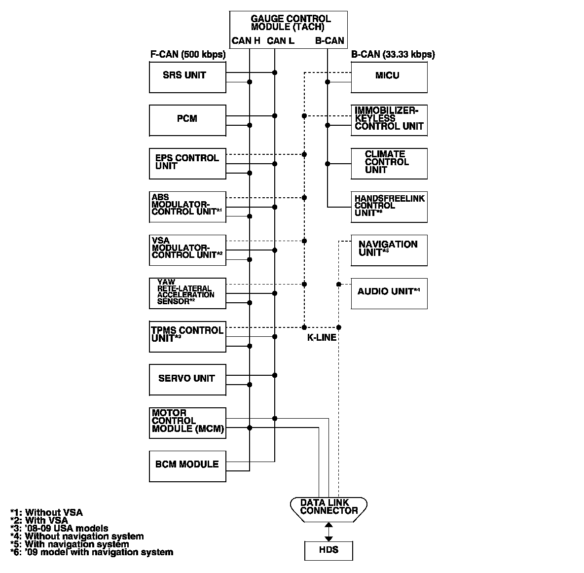 By connecting the HDS to the data link connector (DLC), the HDS can retrieve and indicate the diagnostic results from the MICU via a diagnostic line called K-LINE. The K-LINE is distinguished from the CAN line, and connected to the CAN related ECUs. The MICU is a gateway between the HDS and B-CAN related ECUs, and sends B-CAN diagnostic results to the HDS.