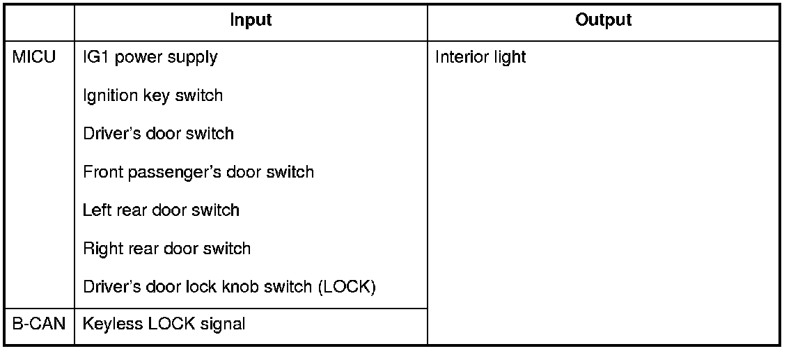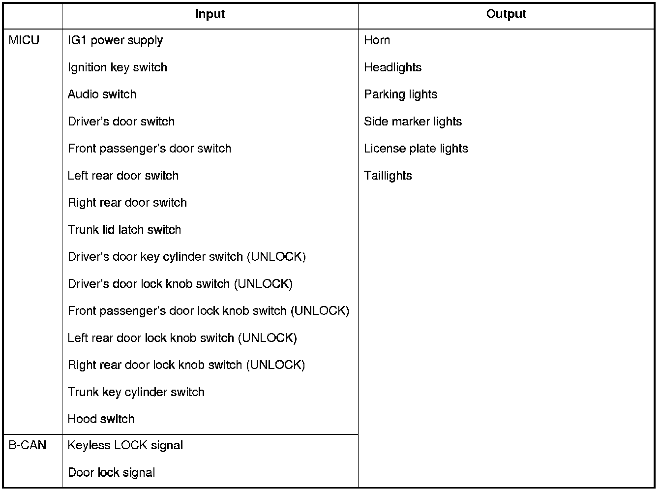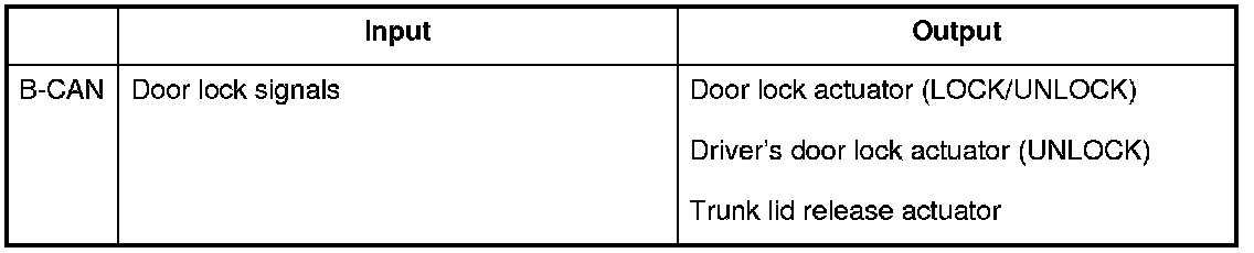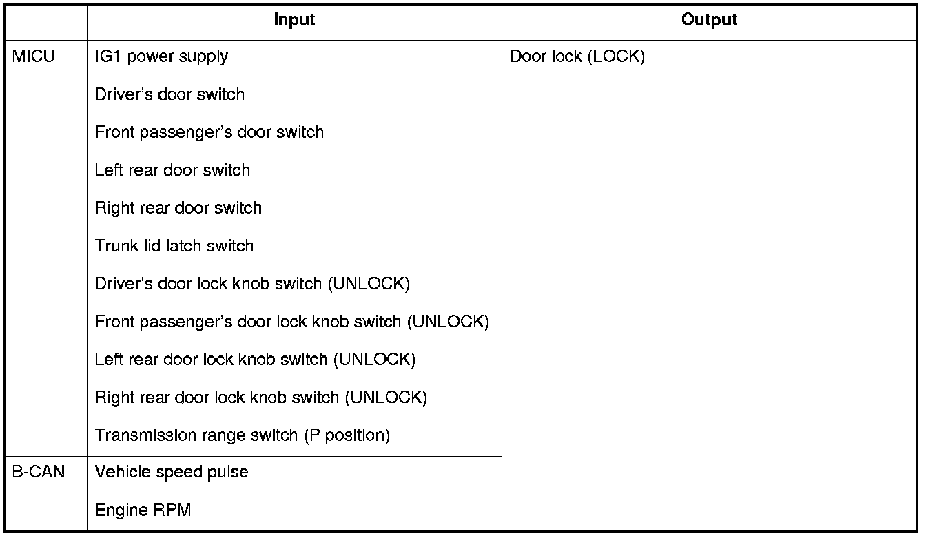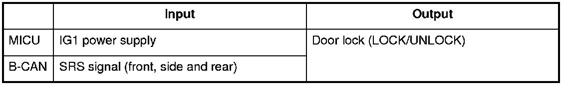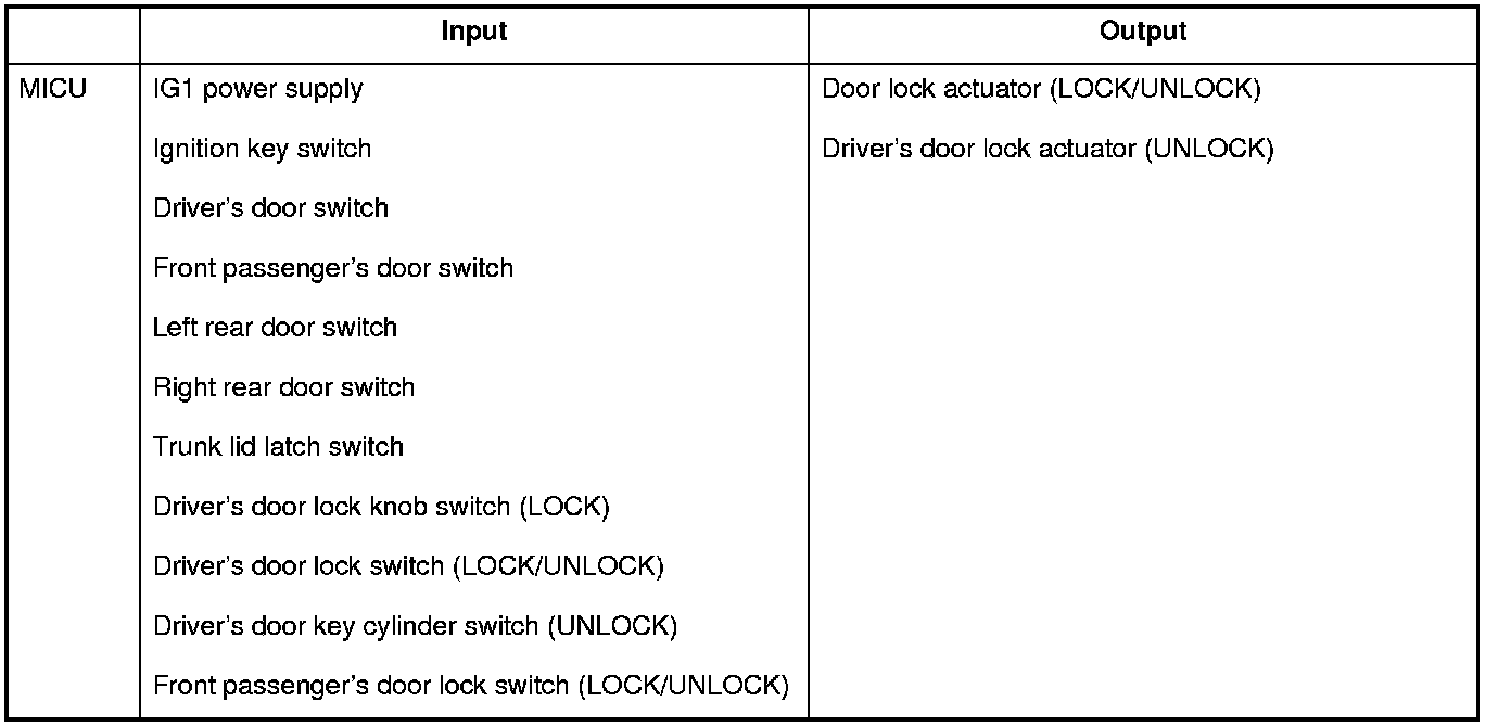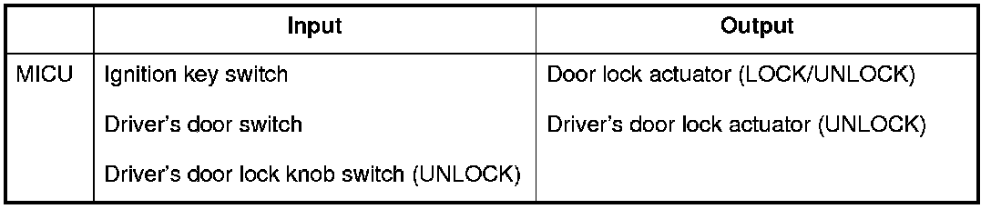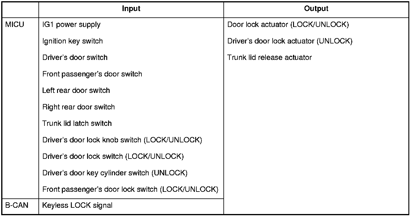 The MICU controls the door lock actuators based upon B-CAN signals and input signals from each switch.