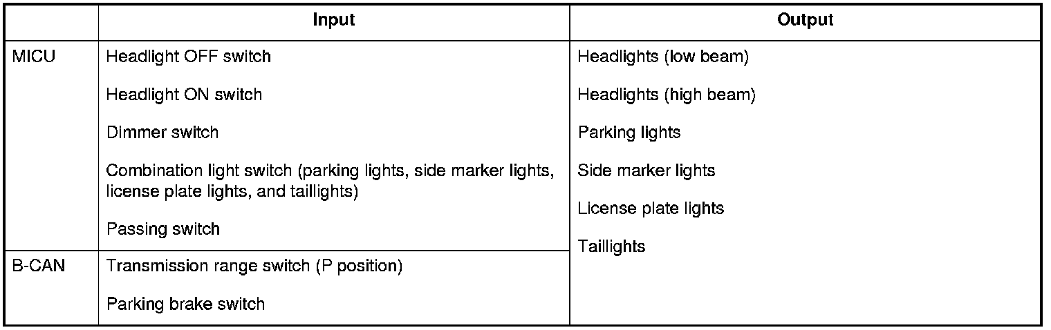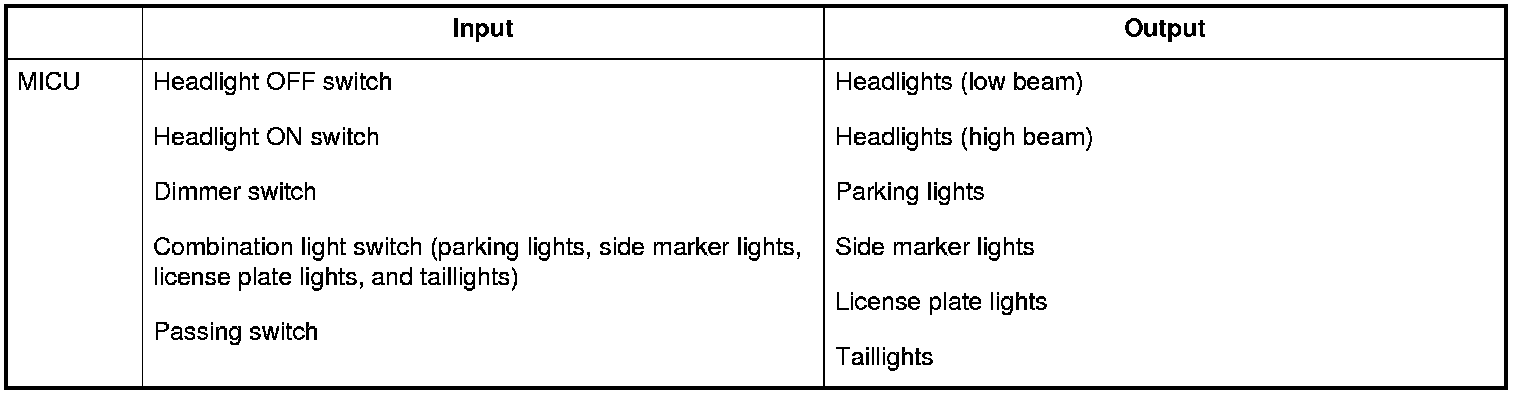 The MICU contains the relay circuits for the headlight high/low beams and taillights, and controls the lighting system ON/OFF based upon input signals from the combination light switch.