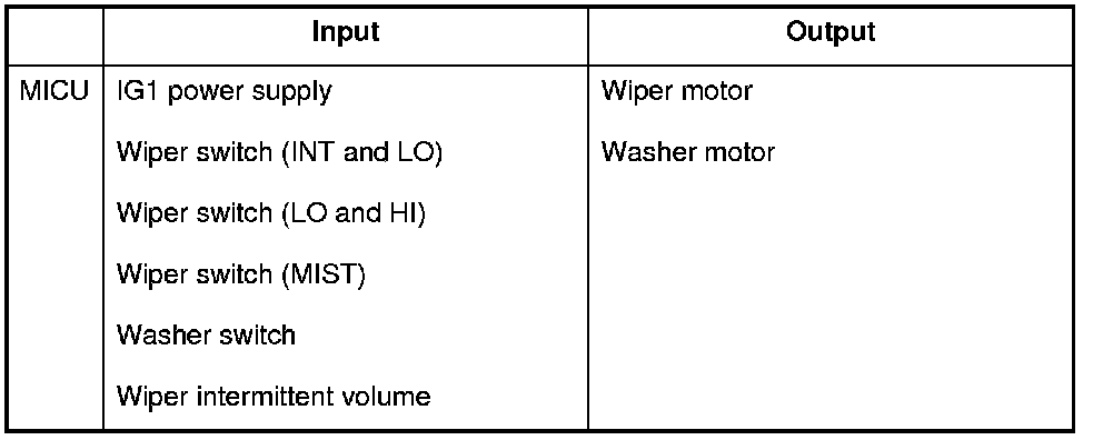 The MICU controls the wiper motor and the washer motor based upon IG1 and wiper/washer switch signals.