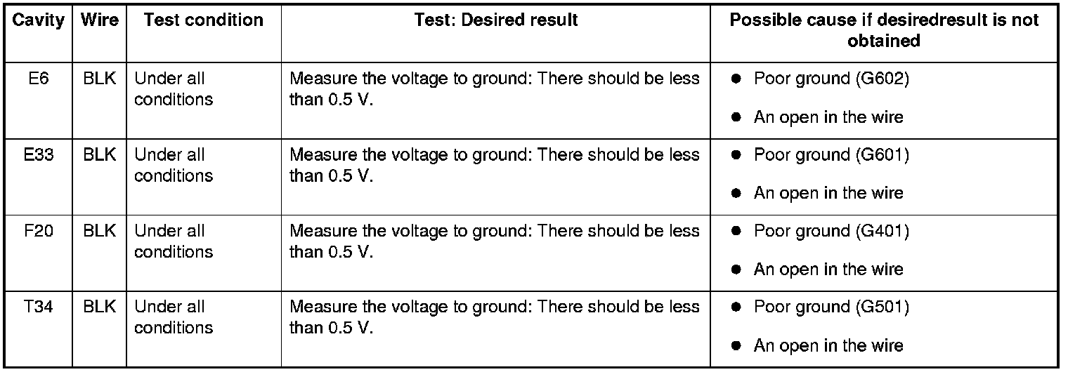 6. Reconnect the connectors to the under-dash fuse/relay box, and do these input tests at the following connectors.