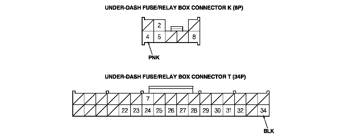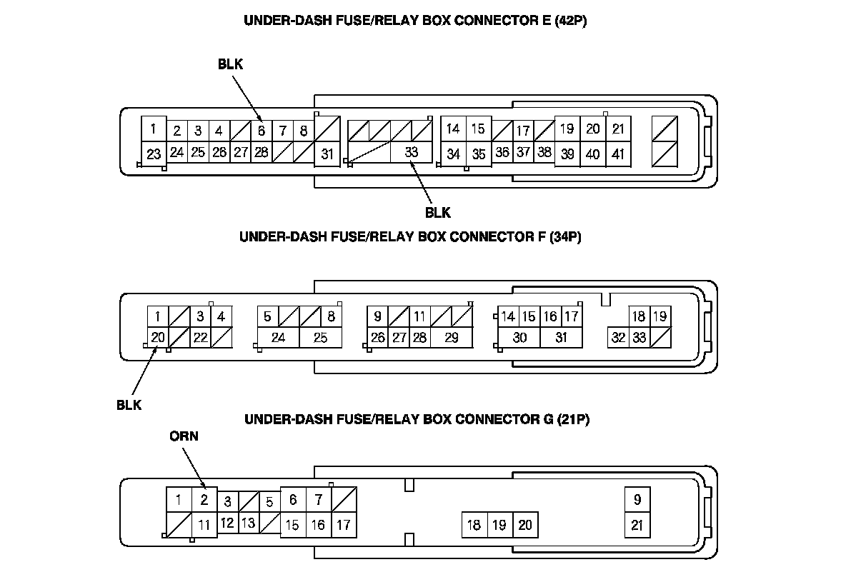 3. Disconnect under-dash fuse/relay box connectors E, F, G, K, and T.