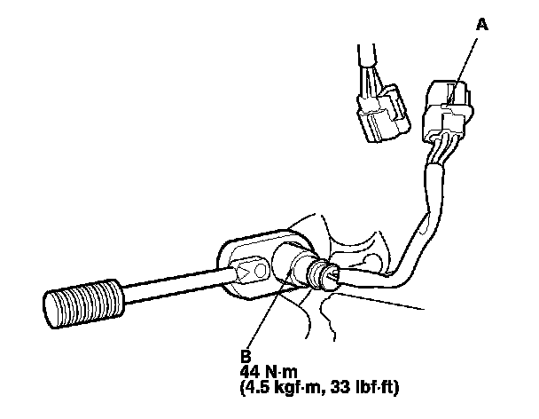 1. Disconnect the secondary HO2S 4P connector (A), then remove the secondary HO2S (B).