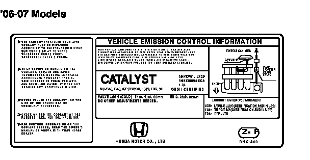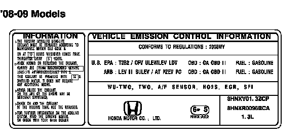 THIS VEHICLE CONFORMS TO U.S. EPA TIER 2 BIN 2 AND CFV ULEV REGULATIONS APPLICABLE TO 2007 MODEL YEAR NEW PASSENGER CARS AND CALIFORNIA REGULATIONS APPLICABLE TO 2007 MODEL YEAR NEW LEV II SULEV PASSENGER CARS. THIS VEHICLE HAS ALSO BEEN CERTIFIED AS AN AT-PZEV BY CALIFORNIA AIR RESOURCES BOARD. EPA CERTIFICATION TEST FUEL FOR CFV: EPA UNLEADED GASOLINE.