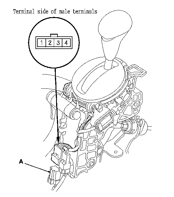 4. Shift out of P, and check for continuity between connector terminals No. 3 and No. 4.