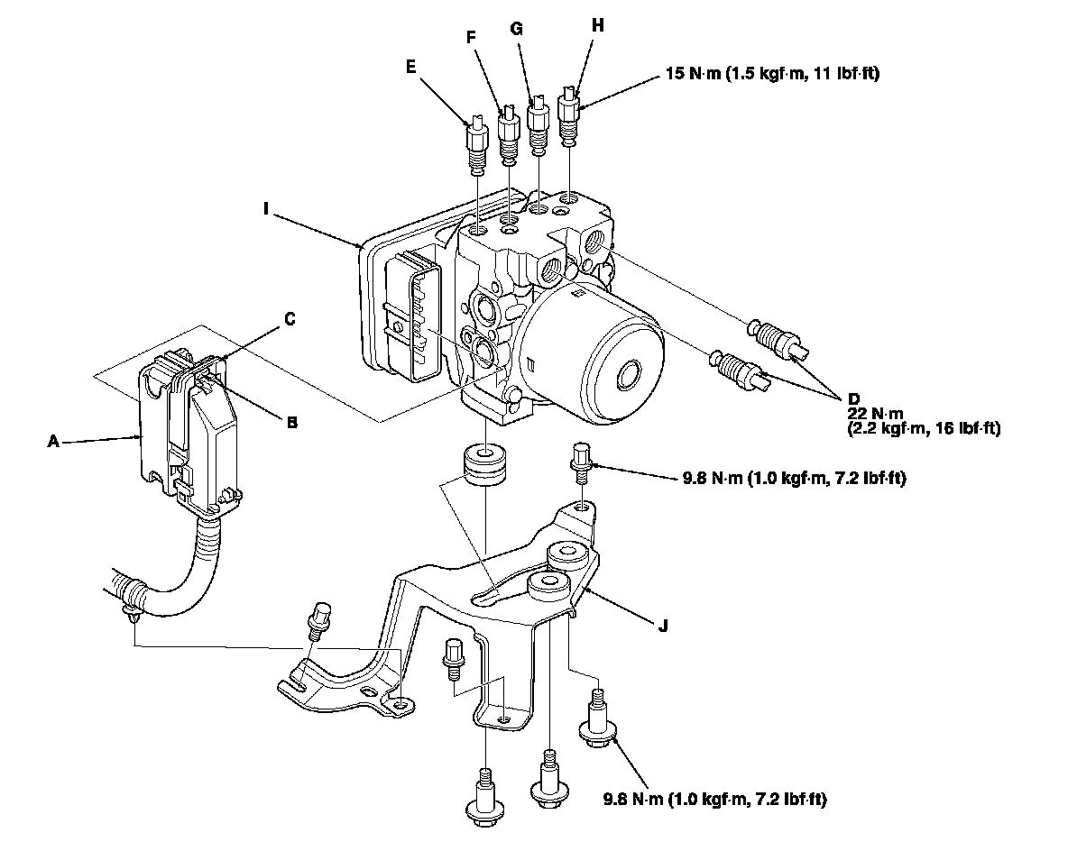 4. Remove the VSA modulator-control unit (I) with the bracket (J) from the body.