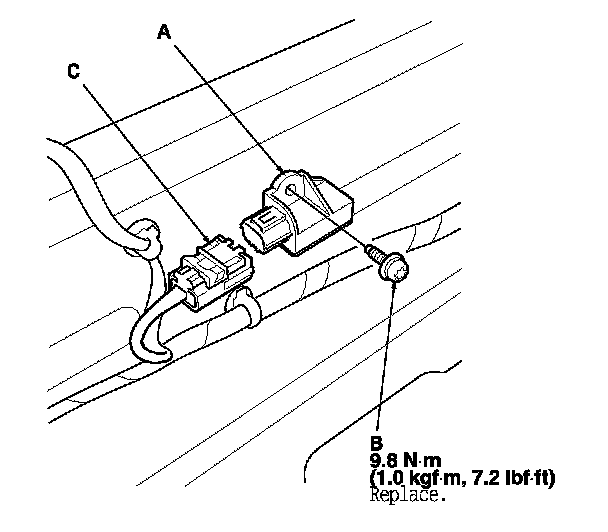 1. Install the rear safing sensor (A) with a new TORX bolt (B) then connect the floor wire harness 4P connector (C) to the rear safing sensor.