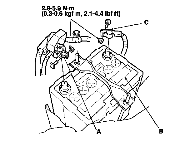 3. Reconnect the positive cable (A) to the battery (B) first, then reconnect the negative cable (C) to the battery.