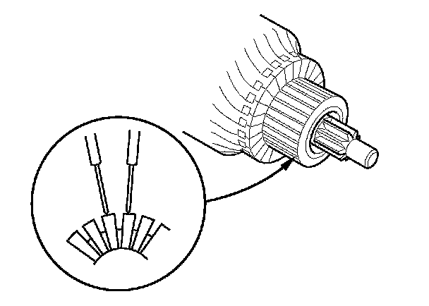8. Use an ohmmeter to check for continuity between the segments of the commutator. If there is an open circuit between any segments, replace the armature.