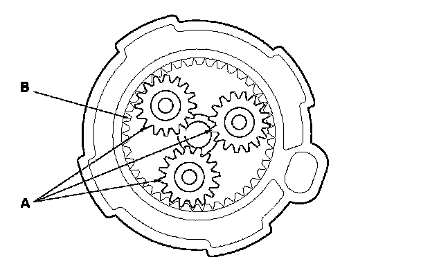 13. Check the planetary gears (A) and the internal ring gear (B). Replace them if they are worn or damaged.